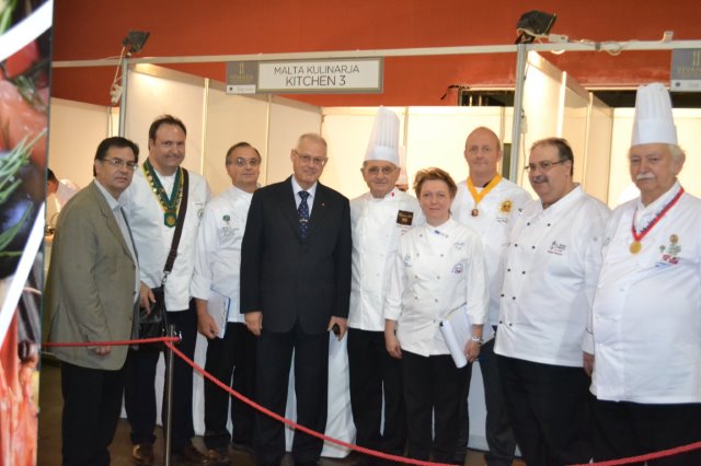 Chev Tony Coleiro, Chairman Malta Tourism Authority Enforcement Board visiting the Executive Council of The Malta Chefs Society at the biennial Malta Kulinarja, the local culinary competition hosting local and internationally Chefs. Also seen on photo Charles Aquilina Sous Chef receiving Trophy. Also showing, photo taken with Lino Schembri CEO MCS, Ralf Meninghini Germany, Fernando Bassi Italy, Guido Debono President MCS, Gabriella Costi Italy, Daniel Ayton, UK, Roger Debono Senior committee Member MCS, Bill Kendrew MC.