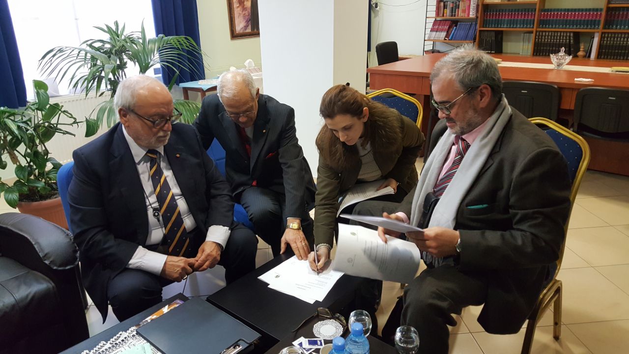 February 2018 - Tirana,Albania: Baron Chev. Anthony C. Coleiro assisting Profs. Alfred Josef Baldacchino Rector Magnificus of the Universitas Sancti Cyrilli and Dr. Francesco Favia Representative for Albania respectively during the signing of an Academic Collaboration Agreement with the Rector of Logos University Tirana Albania.