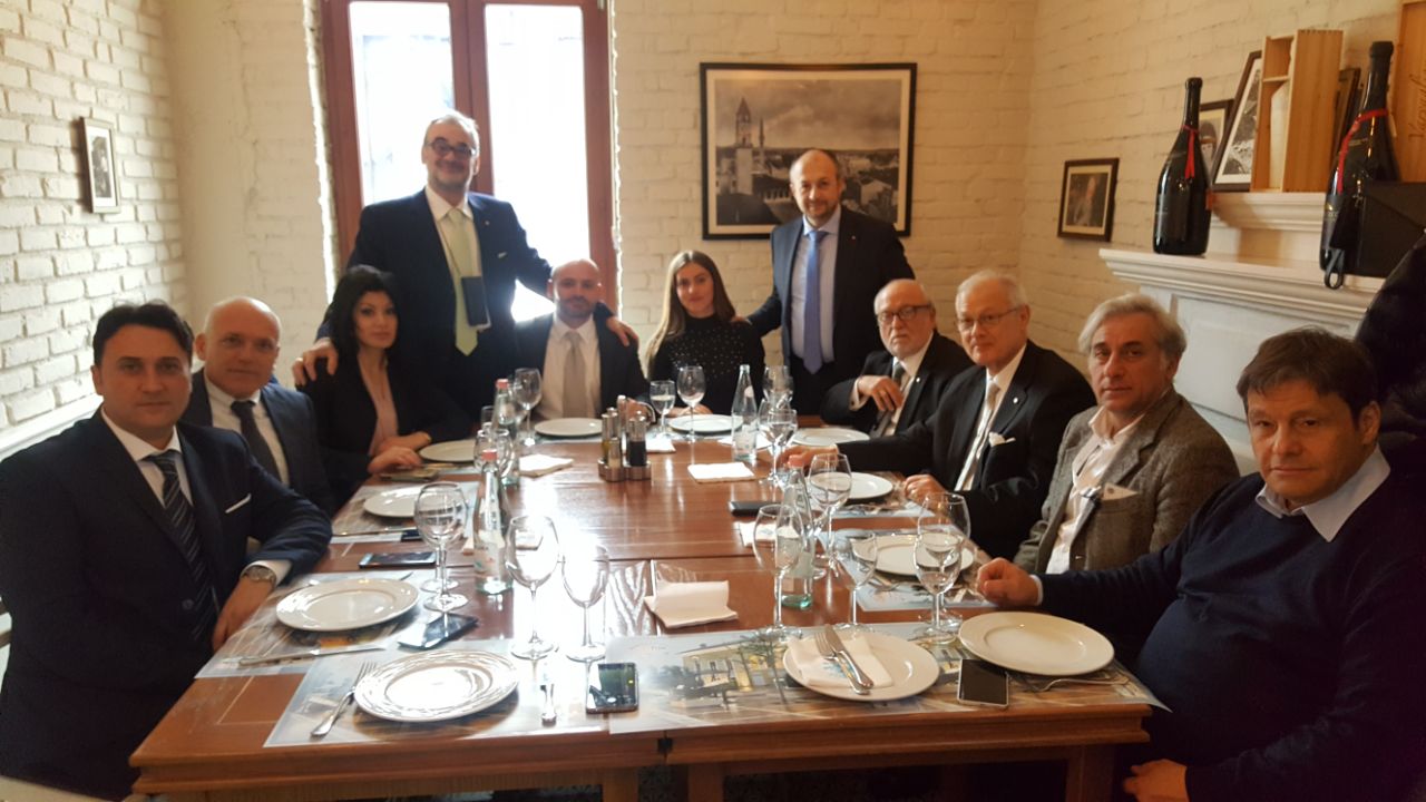 February 2018 - Tirana, Albania: Baron Chev. Anthony C. Coleiro during a business lunch with colleague members of the Scientific Committee of the newly formed Byzantine Research Bureau after being appointed Treasurer of the Bureau. The Byzantine Research Bureau jointly the Albania Tourism Agency - Ministry for Tourism & Environment, and Universitas Sancti Cyrilli - Malta, hosted the first International Conference on Tourism and Migration, Economic Policies in the Mediterranean Ar