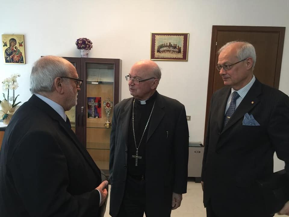 Tirana Albania April 2019 - Prince Grand Master Prof. Alfred Josef Baldacchino - Ordo Byzantinus Sancti Sepulchri and Grand Chancellor Baron Chev. Anthony C Coleiro called upon His Lordship Mgr. George Frendo, Bishop of Tirana and Durazzo. Accompanied by Dame Commander Prof. Iris Cekani, OBSS Prior of Tirana and Chev Grand Officer Prof. Francesco Favia, OBSS National Delegate for Albania.