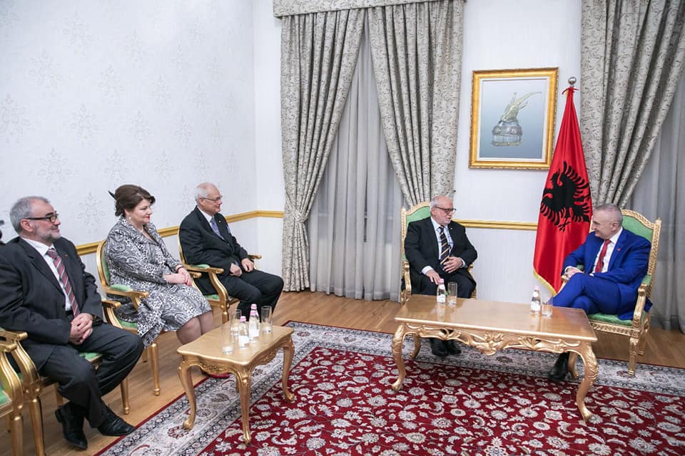 Tirana Albania April 2019 - Prince Grand Master Prof. Alfred Josef Baldacchino - Ordo Byzantinus Sancti Sepulchri and Grand Chancellor Baron Chev. Anthony C Coleiro called upon His Excellency Ilir Meta President of the Republic of Albania. Accompanied by Dame Commander Prof. Iris Cekani, OBSS Prior of Tirana and Chev Grand Officer Prof. Francesco Favia, OBSS National Delegate for Albania.