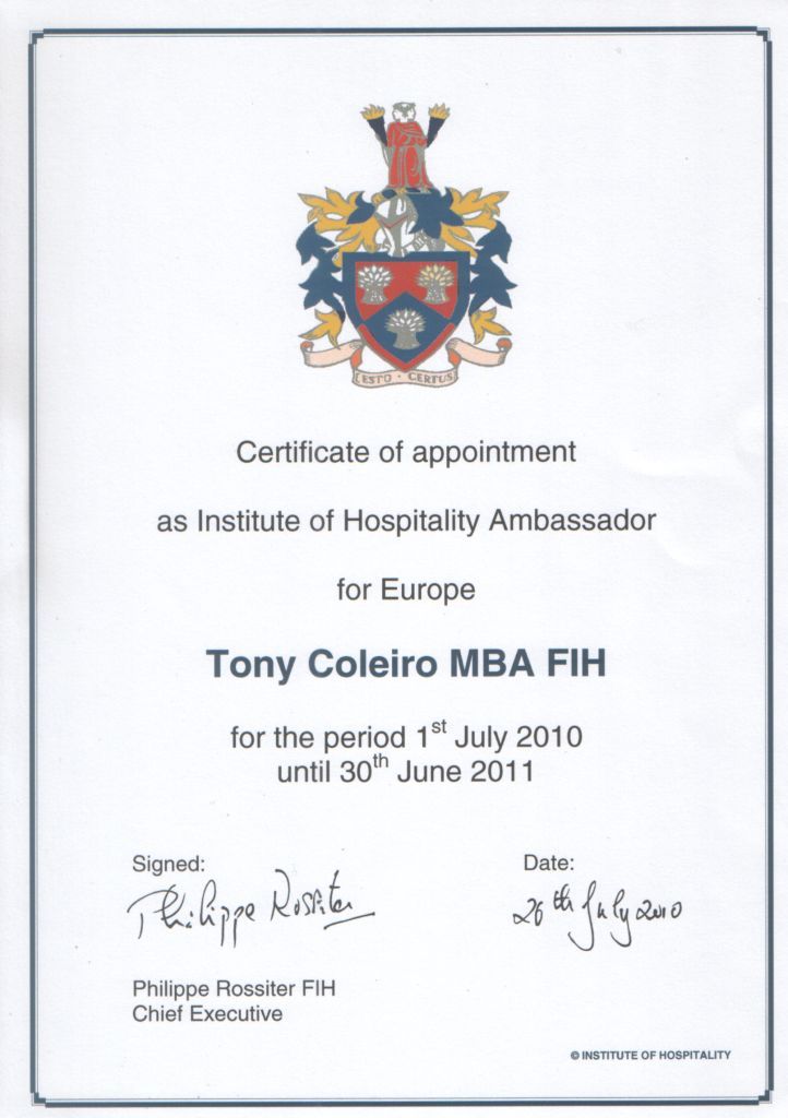 Chev Tony Coleiro M.B.A., F.I.H., F.I.S.M.M., F.Inst.T.T., F.T.E., M.L.J., O.B.S.S. has been appointed Tourism Ambassador for Europe, by the Executive Council, and The International Board of Ambassadors of the Institute of Hospitality which represents professional managers in the hospitality, leisure and tourism industries and has a worldwide membership with members represented in all sectors of the industry including hotels, contract catering, restaurants, pubs and clubs, as well as leisure outlets, theme parks and sports venues. The Institute of Hospitality is managed as an educational institution, and exists to benefit its members in their career and professional development, as well as continuing to improve industry sector standards. The primary purpose of the Institute of Hospitality is to promote the highest professional standards of management and education in the international hospitality, leisure and tourism industries.